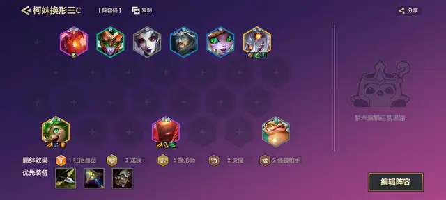 理由是:换形带来了高额血量,贝蕾亚生存空间更高,6换形或者8换形,已经让前排非常肉,放弃主坦,这套阵容柯妹儿称为就换形3C,由贝蕾亚/韦鲁斯/小火龙带装备。