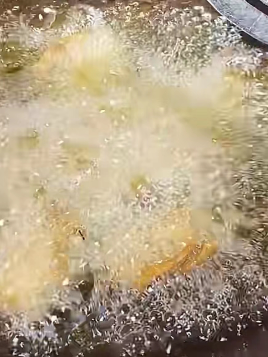 3.腌制好的带鱼把所有的料头去掉,加入玉米淀粉拍至均匀,油温六成热下入带鱼中火炸至两三分钟炸至定型金黄捞出,油温升高二次复炸中小火10秒钟左右,炸至香酥出锅装盘撒入万能椒盐开吃。