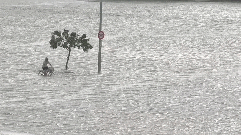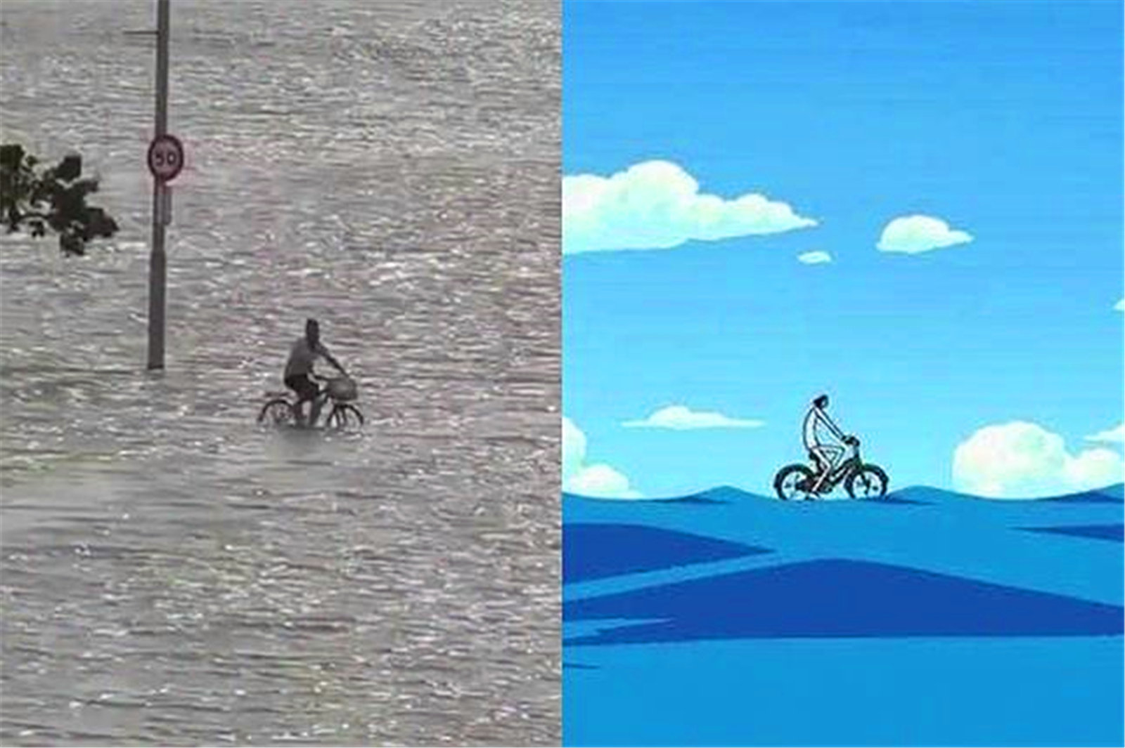 我们看到:由于台风影响,地上都是水。不知道是不是拍摄者有意为之,画面周边并没有什么大型“参照物”,虽然有一棵树和一根电线杆,但是整个场面还是有“大海”的感觉。而一位男子就在淹水的地面上骑着自行车,优哉游哉,来去自如,对于动漫迷们来说,此幕让人倍感亲切,这不就是知名人气作品《航海王(也称海贼王)》里的库赞(也称青雉)嘛!