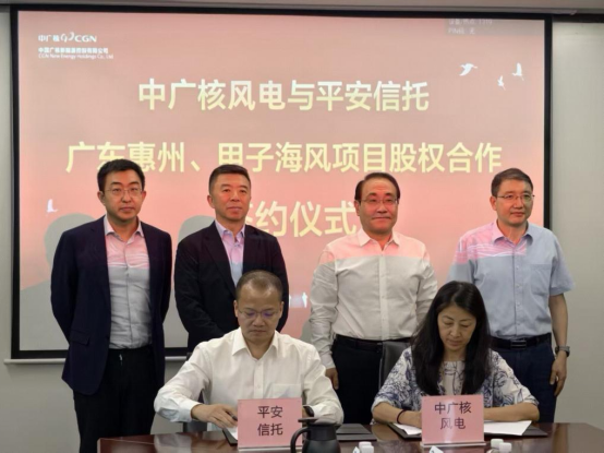平安信托副总经理李宇航(后排左二),中广核风电党委书记、董事长张志武(后排右二)代表双方出席海风项目股权合作签约仪式