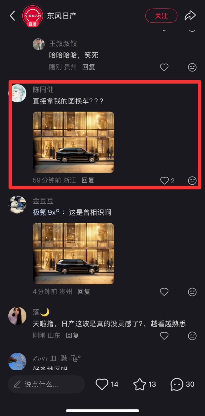 除了不撞车,背景、光影 构图啥都“撞车”了,连人极氪9X的原创设计师都去东风日产官号下面质问
