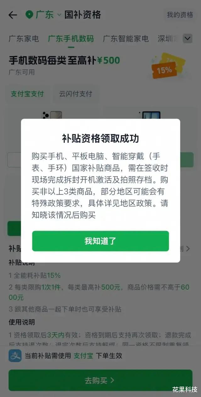 今天广东等部分地区的手机数码产品国补已经正式回归,只要之前没有用过国补的话,就可以直接领到国补名额。