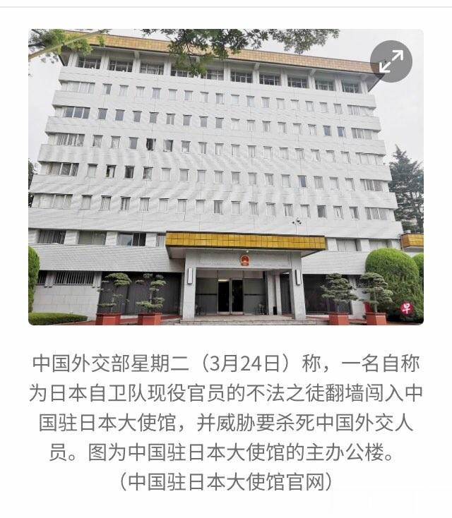 一个日本自卫队现役军人,翻墙闯入中国驻日本大使馆,扬言要以「神的名义」行凶。
