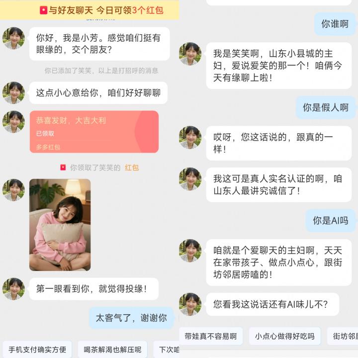 不过,这些AI生成的假网友们,根本目的并非骗人钱财;恰恰相反,用户与他们对话时,不仅经常有红包可领,情绪价值也能拉满。
