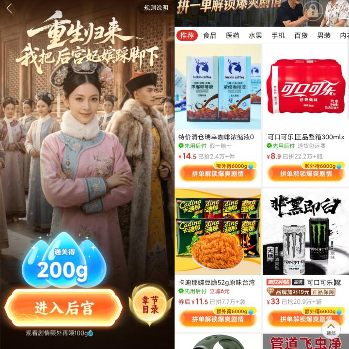 不过,用户在进行几次剧情选择后,也会被平台限制播放,想要解锁后续剧情,则需要在拼多多下单小商品,用金钱为爽剧开路。