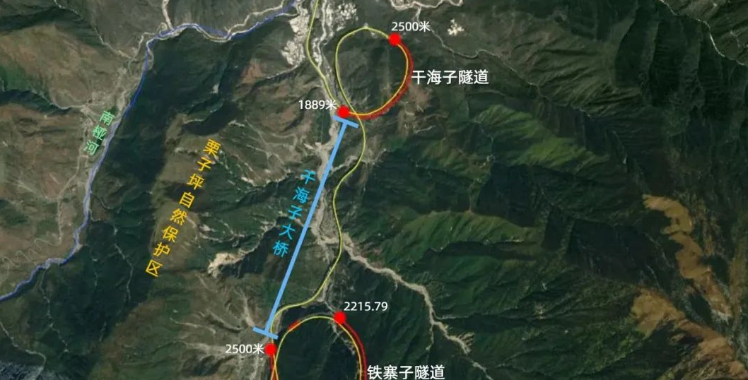 干海子双螺旋隧道,中间以干海子大桥相连接,双螺旋隧道分铁寨子隧道和干海子隧道,这是解决拖乌山短距离爬高的最佳方案,拖乌山的这一段,距离短,海拔高差超过500米,采用双螺旋的方式分别爬升高度,中间再以大桥相联,这是一个创意,如果以后类似的遇到这种情况,我们还可以采用三个螺旋,四个螺旋的方式继续提升短距离爬升高度的问题。