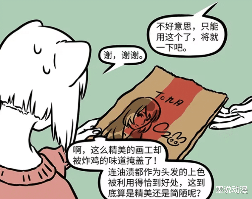 实在找不到纸张,氧气老师用薯条袋子讲究了一下,在上面签了名,还画了画。如此精美的画工,被炸鸡薯条的味道掩盖,连油渍都能作为头发上色。九月不知道眼前这画到底是精致还是简陋,也不知道能否保存比较久。这算是让我们见识到了不一样的一汪空气,这一话还挺有趣。
