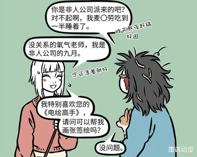 氧气老师才发现,九月是非人公司派过来的业务员,还为此道歉。因为薯条吃到一半睡着了,所以番茄酱才会粘在身上,看起来就像血一样。氧气老师之所以会这么困,也是因为晚上赶稿子。至于九月,用微笑化解尴尬的氛围,也觉得氧气老师活着就行。九月表示特别喜欢她画的《电绘高手》,所以想要跟签名。氧气老师也表示没有问题,这都是小事。
