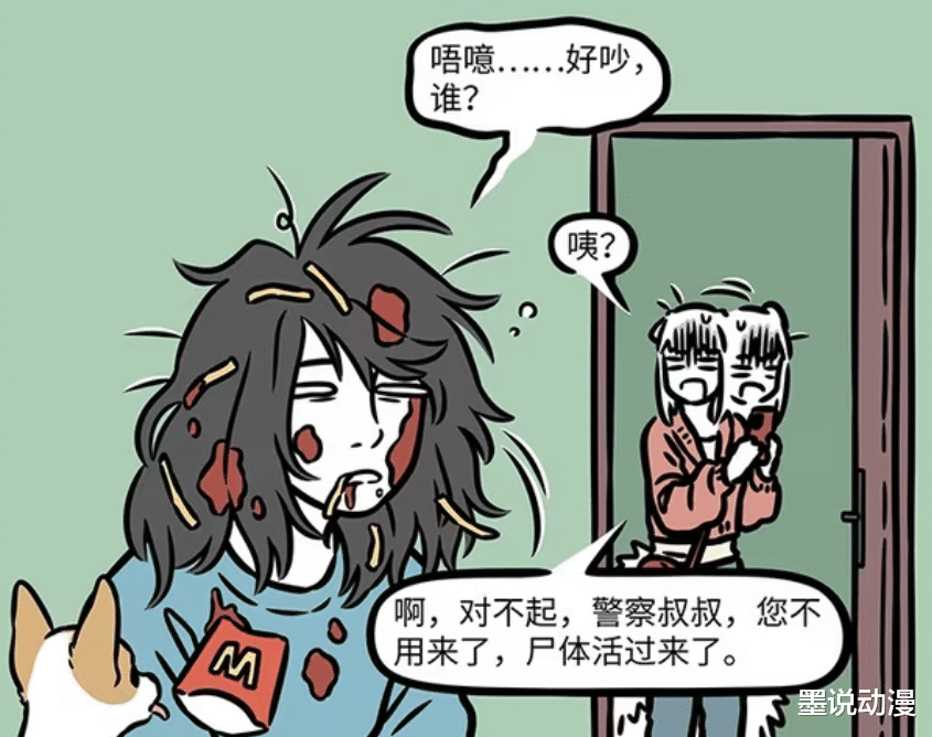 在九月大喊大叫之时,氧气老师“复活”了。九月原本还打电话报警,现在看来不需要。九月只能跟警察叔叔解释,让他们不用过来,因为“尸体”复活了。此时氧气老师的身上,那是沾着薯条和番茄酱,看起来有点邋遢。