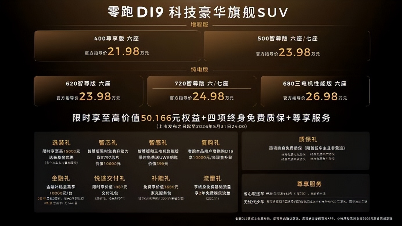 2026年4月16日,零跑旗舰D平台首款车型——零跑D19正式上市,售价21.98-26.98万元。新车定位“科技豪华旗舰SUV”,以旗舰级的美学、舒适、续航、智能、驾控、安全六大全维体验,彻底打破“旗舰即高价”的行业陈规,旨在重塑30万内全尺寸SUV的价值标杆,让真正的旗舰体验成为更多家庭的幸福之选。发布会现场,零跑D系列代言人费翔先生亲临助阵,零跑科技创始人、董事长、CEO朱江明先生为费翔交付首台零跑D19,双方共同见证这款旗舰车型正式上市,标志着零跑品牌向上与科技普惠迈入全新阶段。