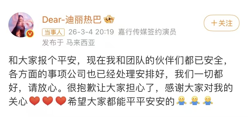 迪丽热巴在中东滞留超三天,她所在的公司被粉丝骂上了热搜三天,终于在3月4号的晚上八点多钟,热巴在自己的账号报了平安。