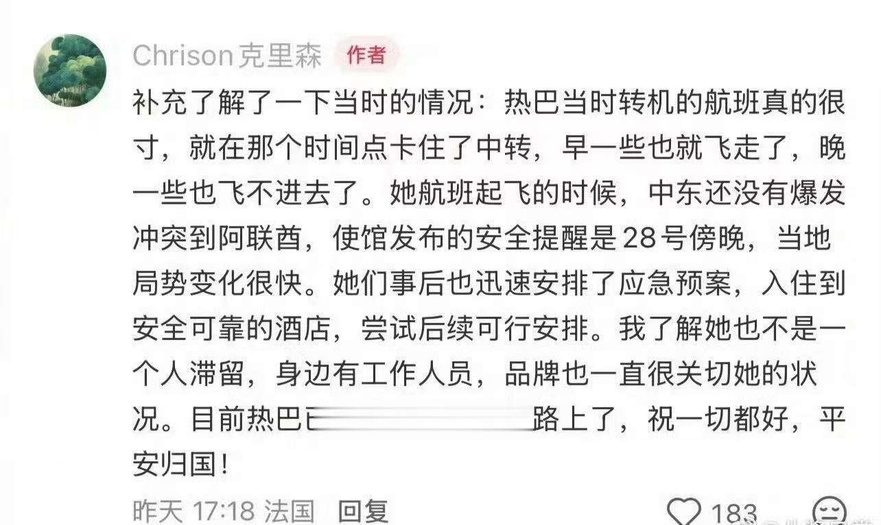 拥有一千多万粉丝的克里森曝光了热巴中转机的细节,他说热巴当时坐的那架飞机的人很拽,本来完全可以避开这次的事件,偏偏航班就要卡在爆发的点上。事发后,热巴跟团队立马找了靠谱的酒店住下,并不断寻找可以离开的航班。其实热巴不能到达巴黎,所有的品牌方都特别担心她,也时刻关注和关心她的状况,还好热巴的粉丝够给力,三天热搜助热巴成功转飞马来西亚。