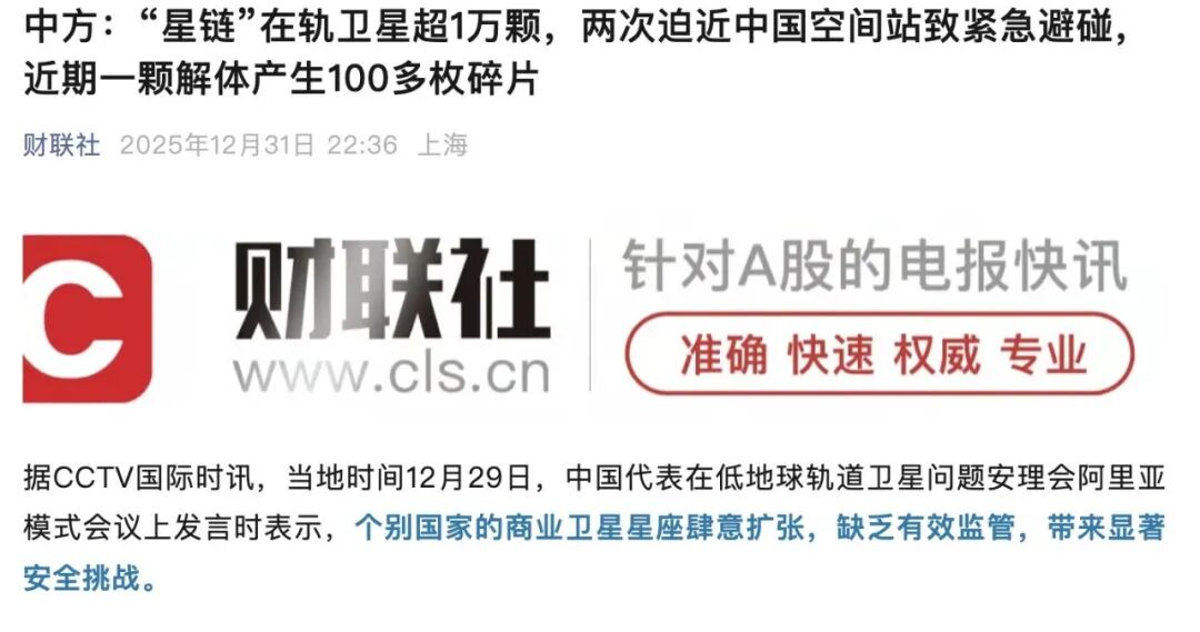 在过去,星链卫星先后两次逼近中国空间站,迫使神舟航天员不得不进行“紧急避碰”;到了最近,又有一颗星链卫星解体,炸出100 多枚碎片。因为安全问题太过突出,中国代表不得不对此进行抗议。