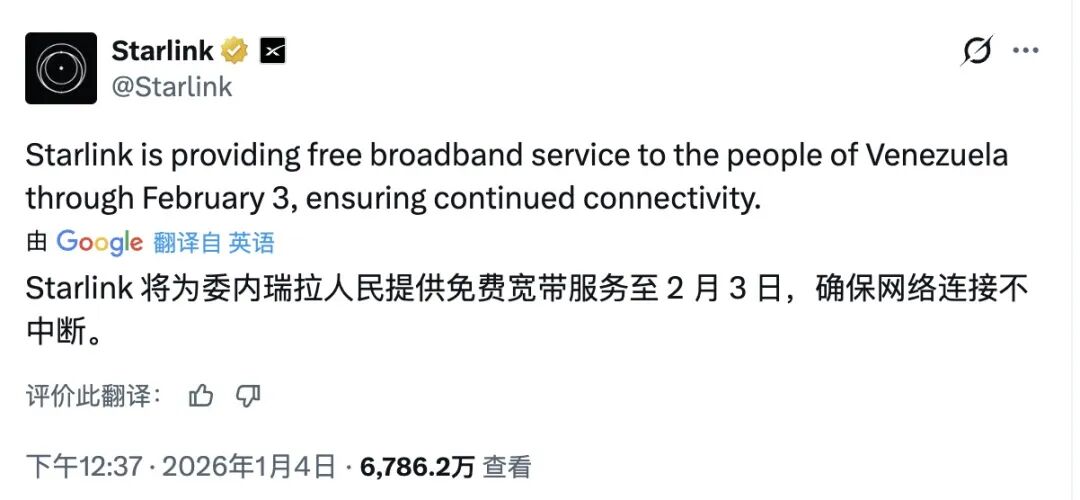 SpaceX的星链在北京时间 3 日发了条动态,说“将为委内瑞拉民众提供免费宽带服务至2月3日,确保网络连接不中断。”