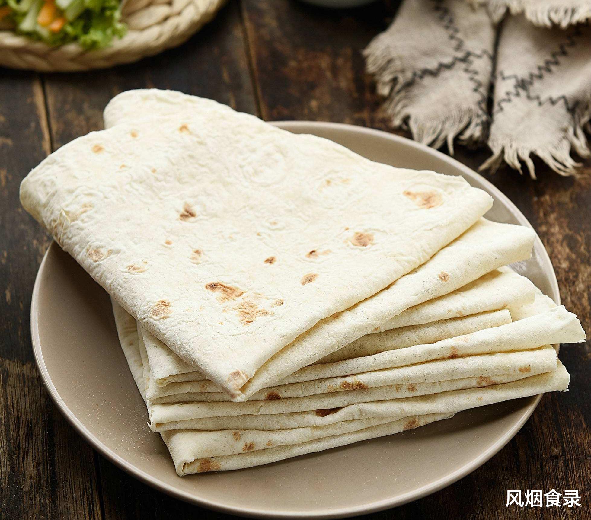未发酵的面团擀成薄如蝉翼的圆片,往铁鏊子上一烙,两分钟出锅,柔韧透光、筋道耐嚼。