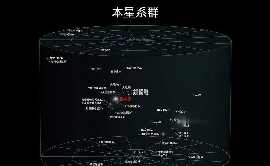 宇宙的尺度是人类不可想象的,目前我们还无法确定它大到何种程度。只知道银河系位于本星系群中,本星系群包含了约50个星系,如银河系、仙女座星系等等,直径达到了1000万光年。