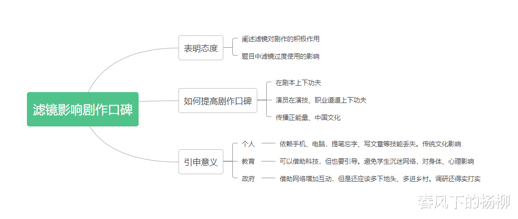 我把这道题的框架大体给大家说一下吧。首先,我觉得首先应该阐述一下滤镜技术的积极影响,毕竟滤镜技术对影视剧作品的作用应该是积极影响大于消极作用的。然后,再结合个人的认识并结合题目中的现象,引出现在的一些剧作对滤镜技术的过度使用,从而导致了剧作口碑的下降相当于把题目所说的现象,结合自己的认识阐述一下。并表明自己的观点。第二阶段,再谈一下如何提高影视剧作的口碑,这个可以分点来说。第三阶段,我认为可以通过这件事情所反映出来的道理,在我们个人成长、工作以及特别是政府工作中会有哪些反应,或者有何启发。这道题的框架基本就定下来了。如下图