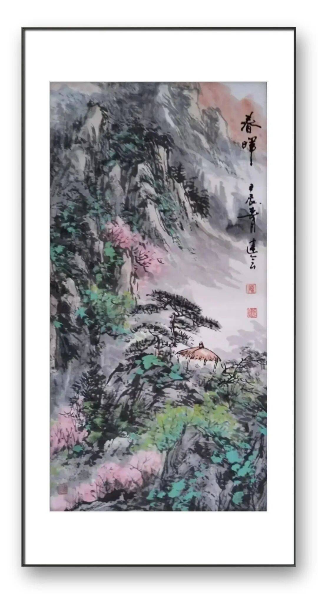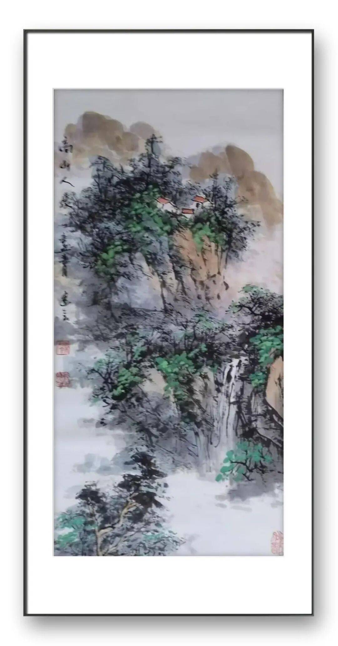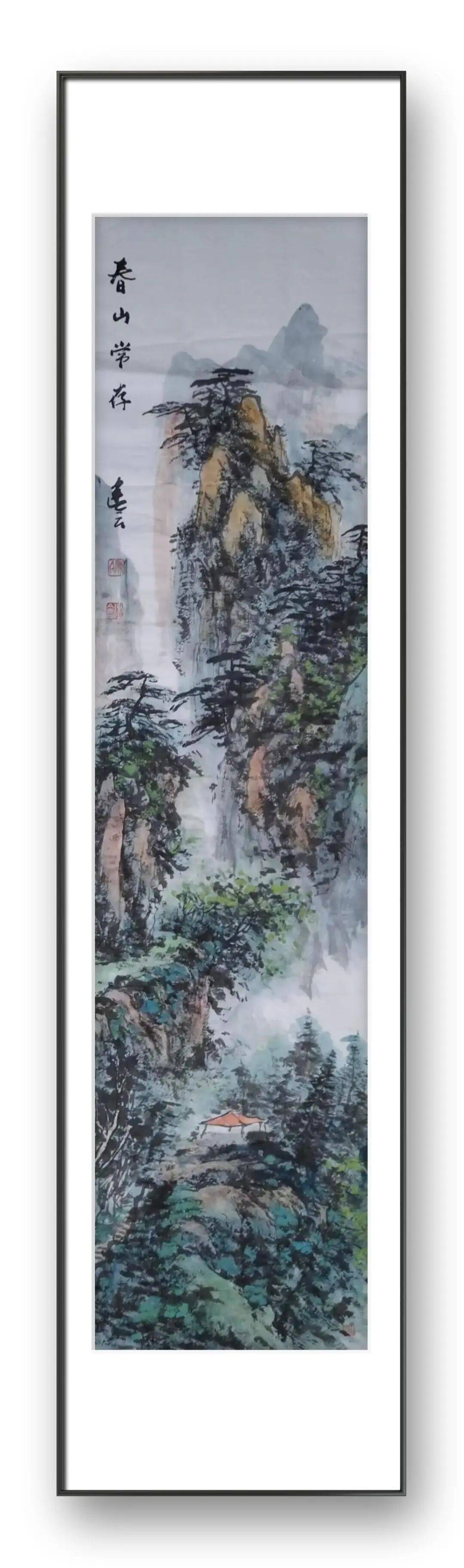 意境的营造,是陈建会先生山水画的另一大艺术特色。他主张“景语皆情语”,强调绘画不仅要再现自然之美,更要表达内心之境,追求“虚实结合、动静相宜、远取其势、近取其质”的艺术效果。在他的作品中,层峦叠嶂的山脉层次罗列,轻重、向背、明晦处理得恰到好处;垂钓小舟静静地泊在波光粼粼的水面,岸上老树新绿、桃花烁烁,眼前古寺与远山翘首相望,色彩明丽、静寂如斯,仿佛能让人屏息倾听寺中的悠悠钟声。这种动静结合的画面,既有山石的沉静厚重,又有流水的灵动活泼;既有草木的生机盎然,又有古寺的悠远静谧,形成了一种清幽淡雅、意境幽远的艺术氛围。