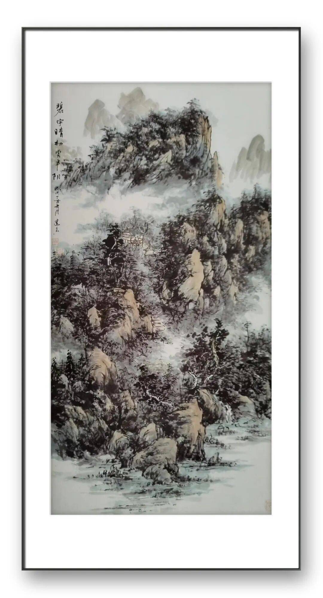 在墨色的运用上,陈建会先生更是匠心独运,深得传统墨法精髓,又勇于突破创新。他擅长“计白当黑”的笔法,墨色明澈秀润,层次清晰分明,浓淡、干湿、焦润的对比恰到好处,将山水在阳光照射或云雾笼罩中的远近隐现之态,表现得惟妙惟肖。观赏先生的作品,远山多采用极淡之笔墨,似有若无、缥缈空灵,隐隐间还透着淡淡的雪色,尽显远山的悠远与神秘;近山则墨色浓淡相间,层层晕染,墨色的厚重与灵动交织,既凸显了山石的峻拔与坚实,又赋予了山川鲜活的生命力。这种墨色的运用,不仅让画面极具层次感与空间感,更营造出一种苍茫厚重、意境幽远的艺术氛围,让观者仿佛置身于浩渺山河之中,感受大自然的神奇与壮美。