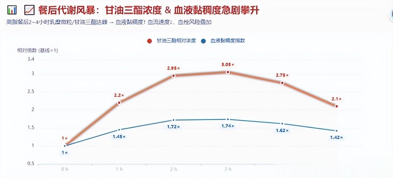 这是因为当你摄入大量高脂肪食物后,血液中的乳糜微粒和甘油三酯浓度会在餐后2到4小时内达到高峰,导致血液黏稠度急剧上升,血流速度减慢。还有一点很多人不知道:你刚吃完饭,身体会优先把血液调去肠胃“加班消化”,这时候心脏那边分到的血就会少一点。