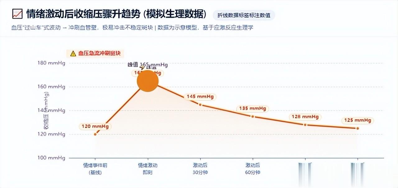 《欧洲心脏杂志》发表过一项关于情绪触发急性冠脉综合征的研究,结果显示,在经历极度愤怒或极度焦虑的2小时内,急性心肌梗死的发病风险会飙升约4.7倍。情绪一激动,身体就会分泌一堆“应激激素”,人一下子就紧绷起来,血管猛地收缩,血压蹭蹭往上冲。