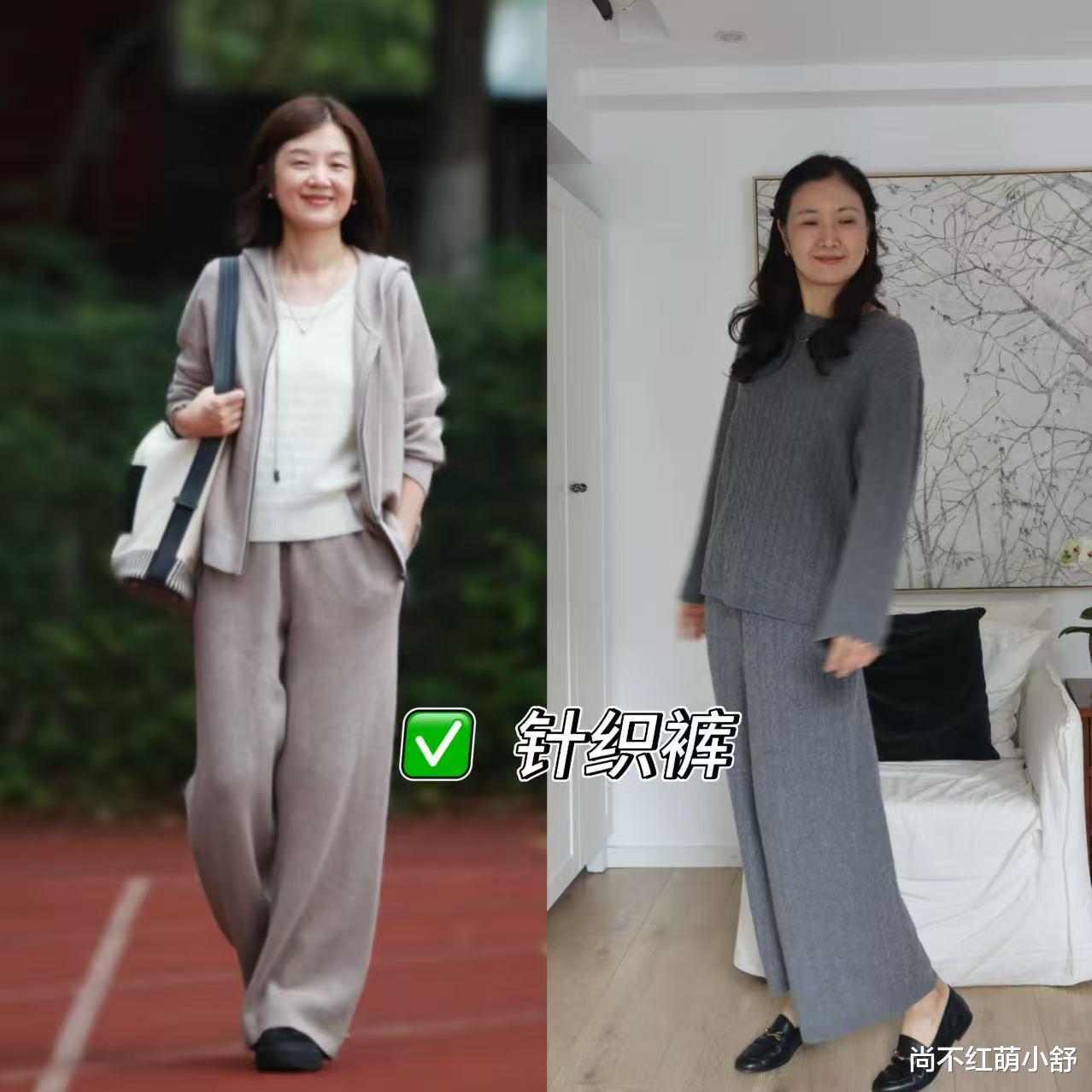 穿搭示范:一条浅咖色针织裤,搭配针织开衫,内搭一件白色的T恤,随意佩戴简约的项链在颈间。无论是搭配运动鞋还是乐福鞋,那种“我毫不费力就很好看”的感觉,正是中年女人最迷人的状态。