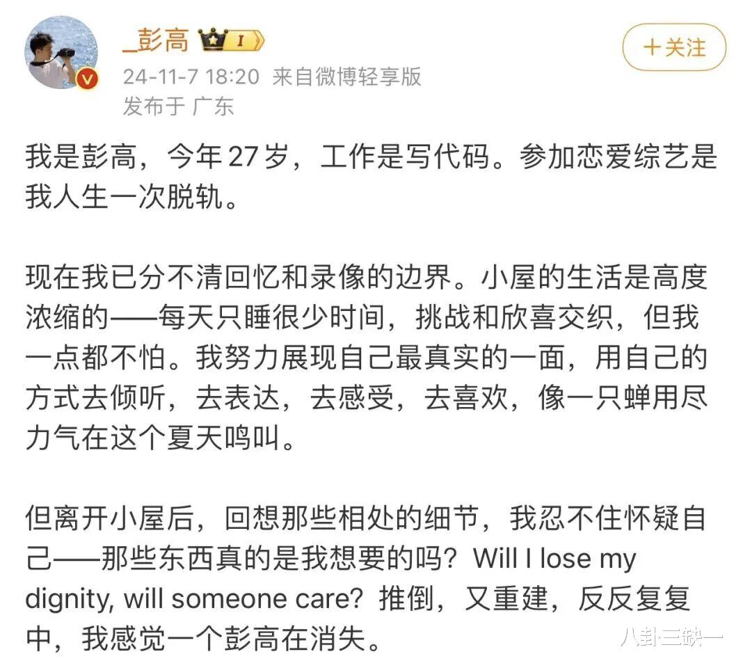 如果好好谈个恋爱,哪怕过个一年半载再官宣分手,也够翁青雅吃互联网这口饭一辈子了,偏偏大小姐心高气傲,私下对彭高爱答不理,结束录制后没几天就断了私下联系,彭高主动找她也常被冷待,连基本的热络都懒得维持。眼看着节目开播热度起来,才想着回头找人家配合炒cp,这还说啥啊,彭高压根不买账。