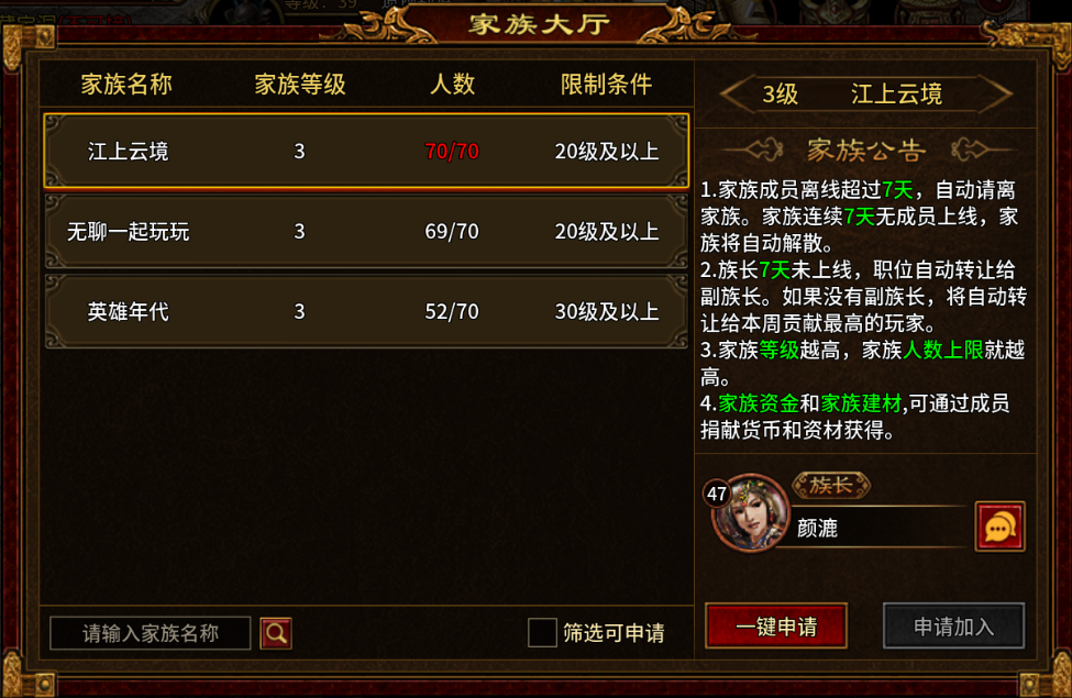 五、核心玩法:行会 + 国战 + 副本,快速融入1. 行会(必加,新手保护伞)30 级加入行会,领取行会福利、双倍经验、专属任务。