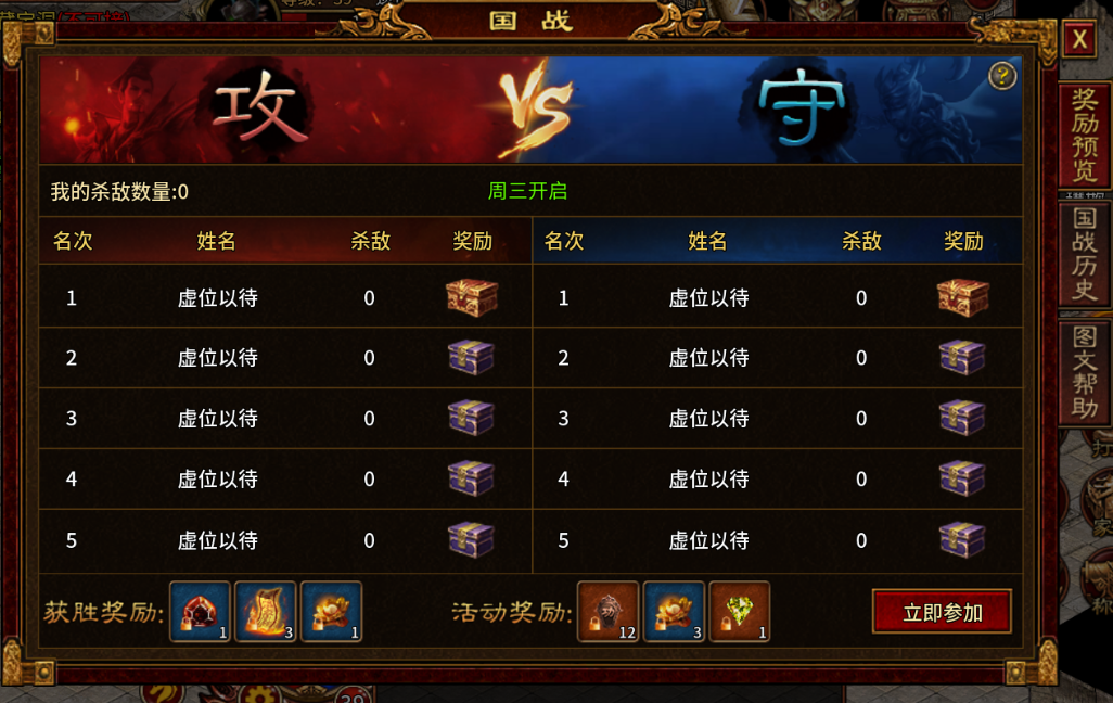 参与国战可获取国战积分、极品装备、大量金币,积分可兑换稀有道具。