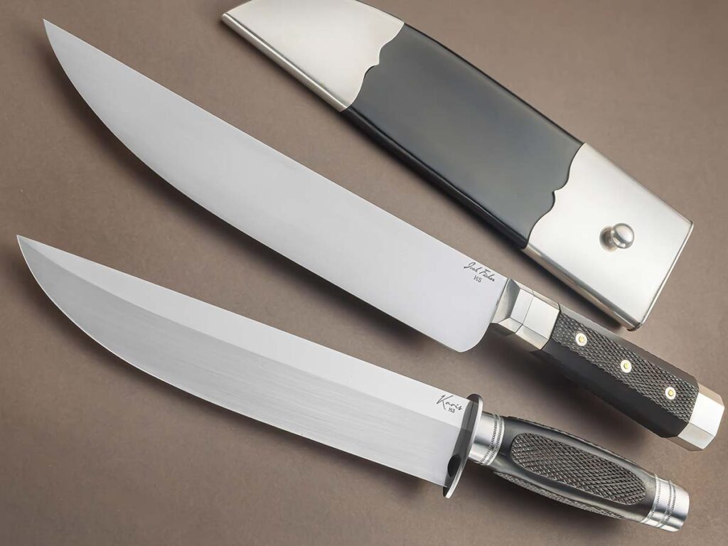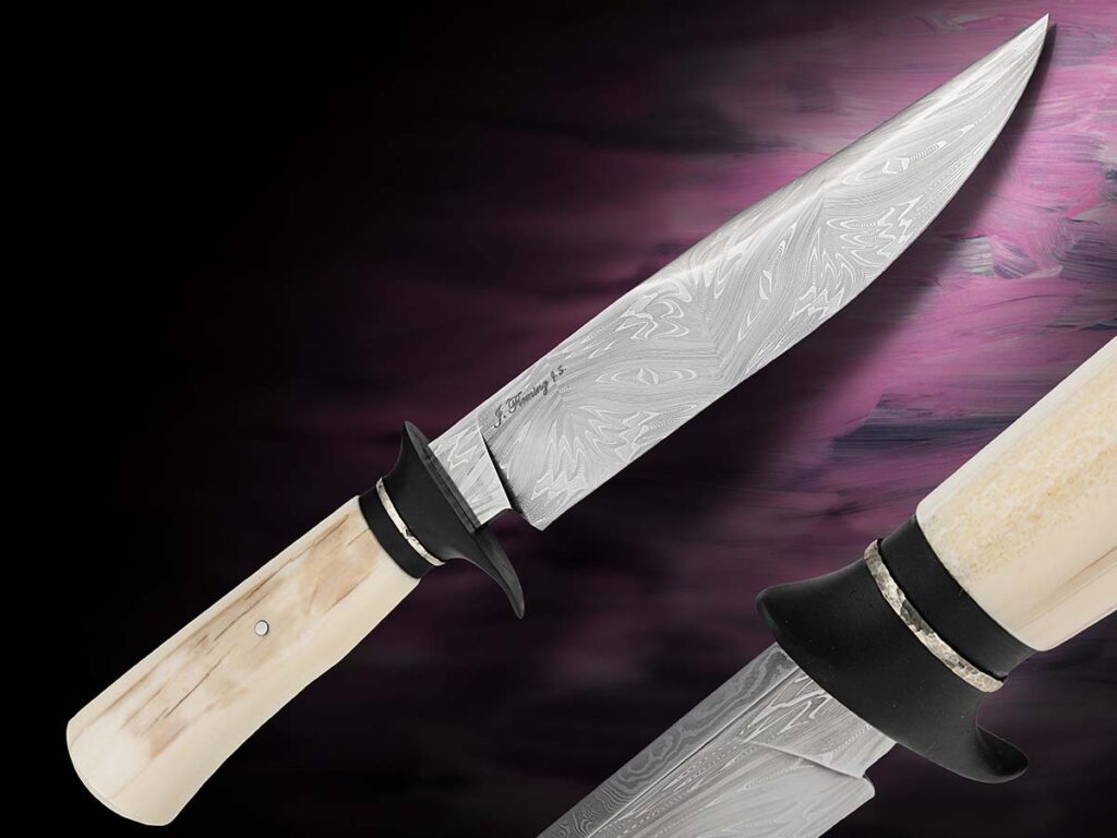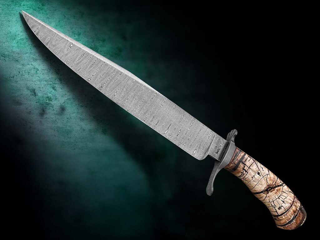吉恩·基米被大型博伊刀设计所吸引,并以一件巨型杰作实现了它。这把长达15.25英寸(约38.7厘米)的庞然大物采用了梯子花纹大马士革钢(花纹由他自己制作的模具打造),并进一步以横切猛犸象牙手柄进行定制。(乔斯林·弗雷泽 供图)