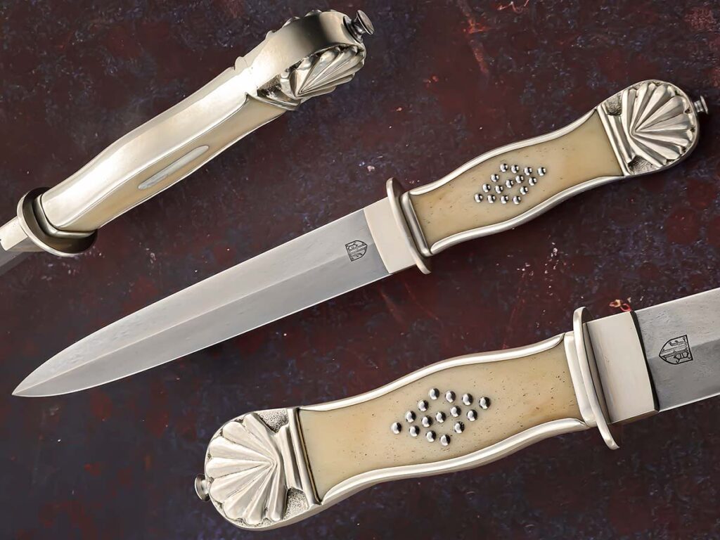 在"废土锻造"工作的ABS资深匠人詹姆斯·弗莱明制作了一把绅士博伊刀,与其他相比尺寸较小,但同样代表了这一风格。6.5英寸(约16.5厘米)的大马士革刀片搭配古代海象牙手柄、镍银垫片和磷化钢刀枕,总长度为11.5英寸。