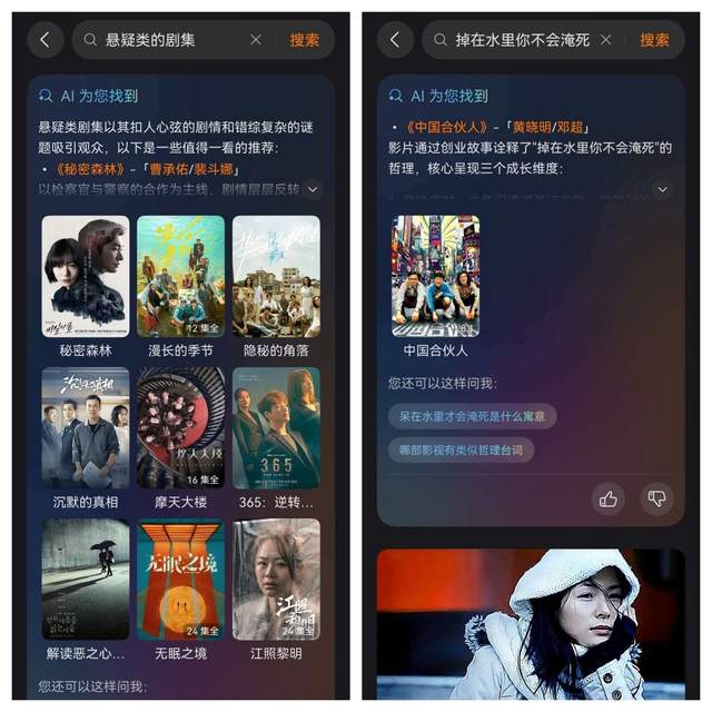 特别要表扬华为视频的“AI搜”,它真的很懂用户。有时候想找电影却记不清片名,只需要输入模糊的剧情描述或者关键词,它就能精准推荐。有一次我只模糊记得某句台词,它竟然也成功找到了对应的剧集,彻底告别了盲目翻找的烦恼。