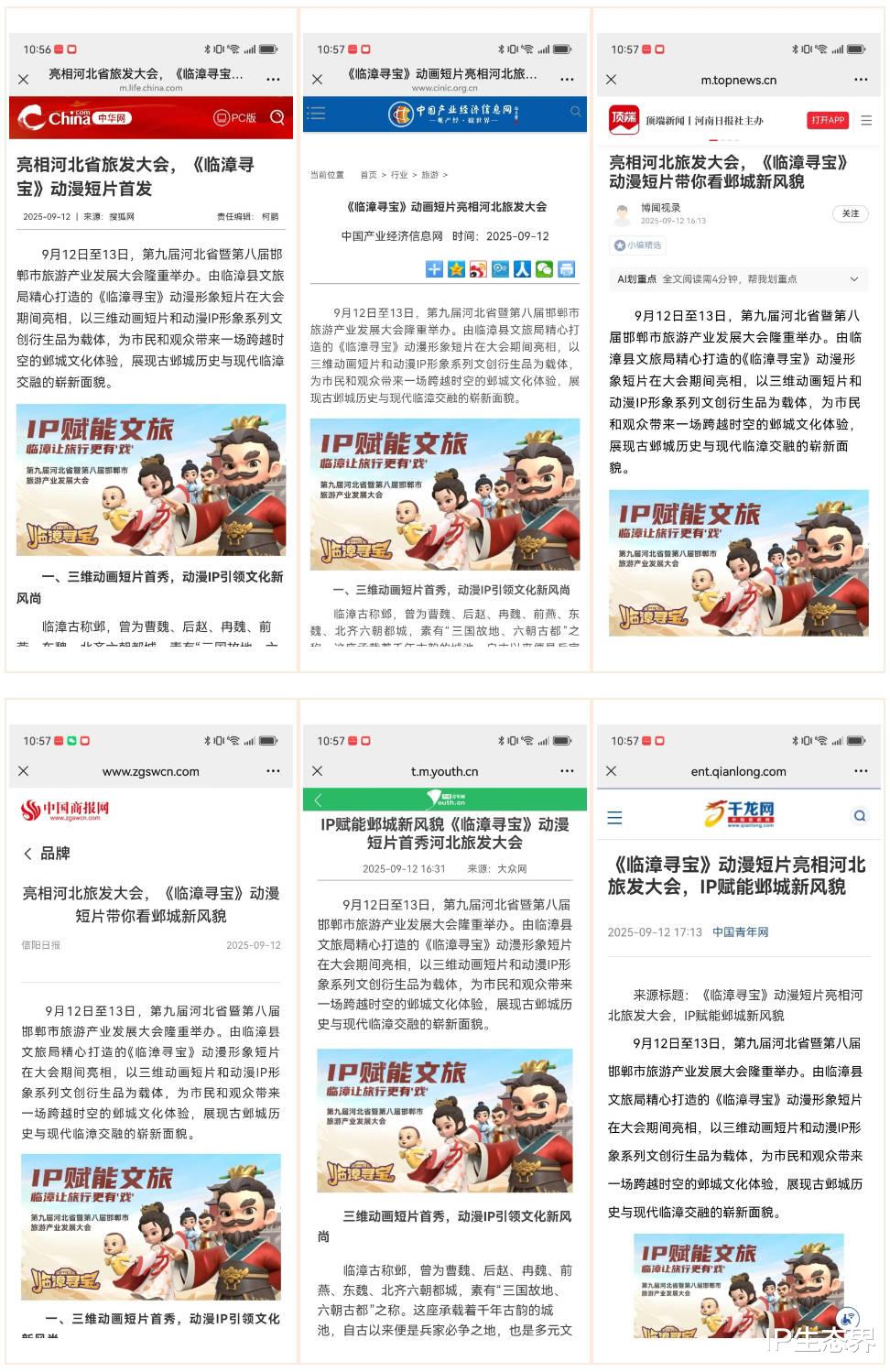 《临漳寻宝》IP自发布以来,便以其独特的历史文化底蕴和创新的现代表现形式吸引了众多关注。在本次旅游产业发展大会上,更是获得了广泛媒体支持。新华网、中国日报、中国网、环球时报、中国发展网、长城网、河青新闻网等数十家央级及河北省级权威媒体报道,同步在腾讯新闻、搜狐新闻、今日头条、百度百家等主流新媒体平台发布,覆盖新闻门户、视频平台、社交媒体等多维渠道,形成立体化传播矩阵。