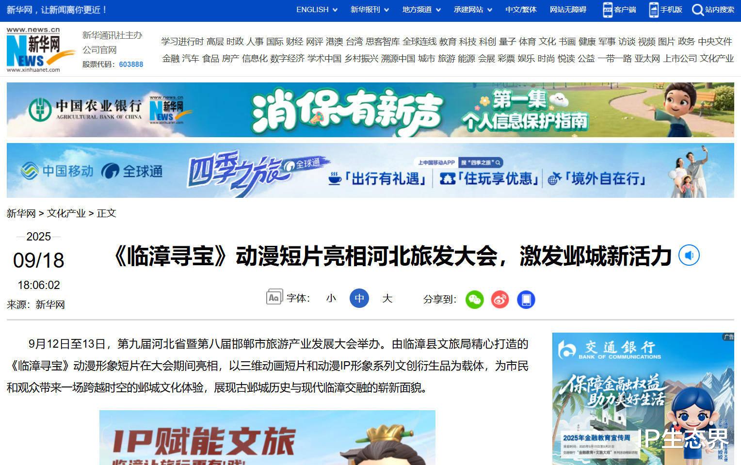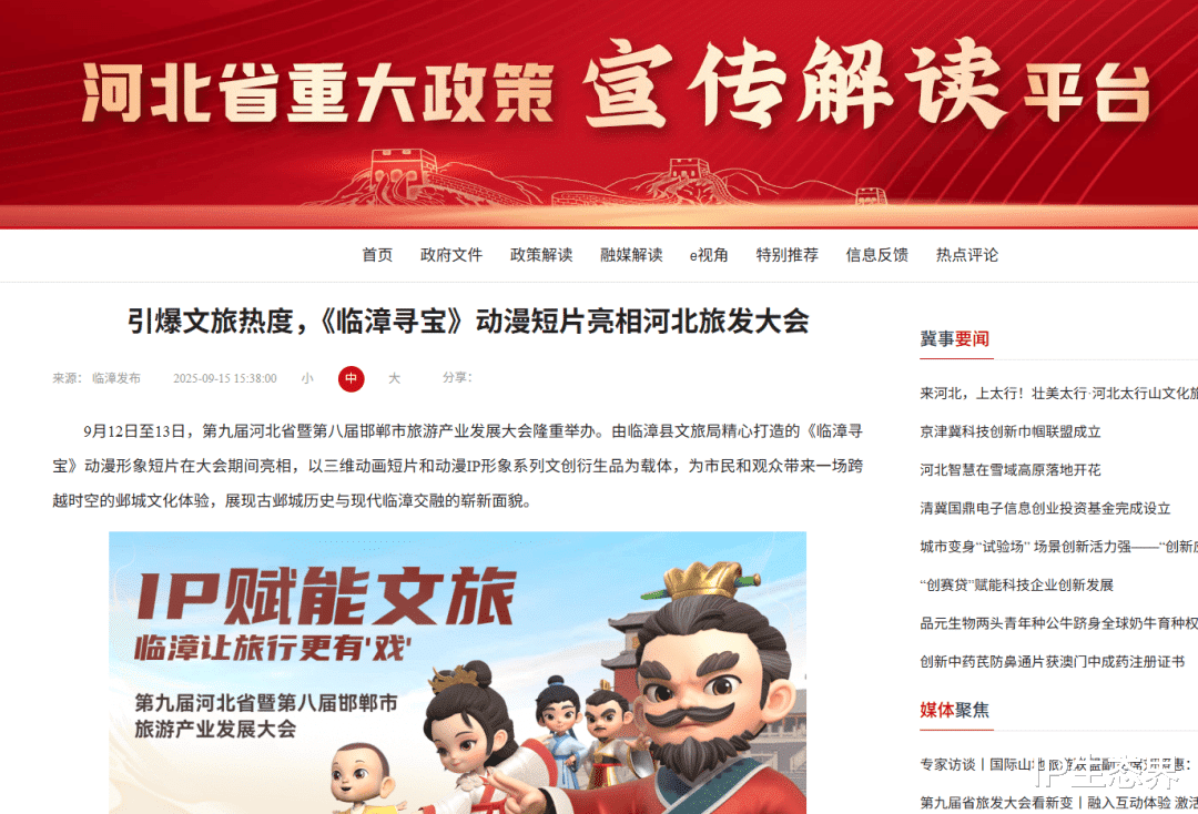 第九届河北省暨第八届邯郸市旅游产业发展大会于9月12日至13日成功举办。期间,由临漳县文旅局打造的文旅IP《临漳寻宝》以其创新的三维动画短片和丰富的文创衍生品,成为大会焦点,引发众多关注与热议。该IP不仅在线下展区吸引大量游客互动体验,更在线上获得新华网、中国日报、中国网、环球时报、中国发展网等多家权威媒体的重点报道,引爆抖音话题、微博话题,并登上微博同城热搜榜单,全网曝光超4000万,成为推动临漳文旅出圈的“新引擎”。