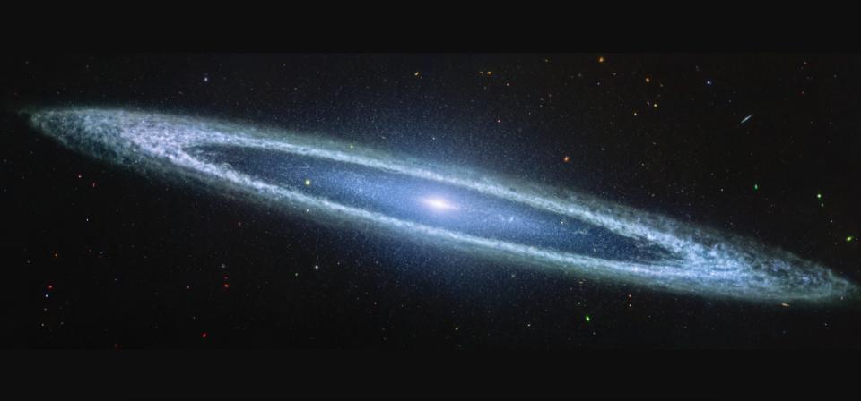 通过JWST的中红外视图仔细观察,草帽星系不再像其名字所暗示的那样像一顶宽边墨西哥帽,而是更像一个射箭靶,中心有一个明显的“靶心”。这个“靶心”实际上是一个超大质量黑洞。韦伯望远镜的中红外仪器(MIRI)提供了极高的分辨率,让我们首次详细地看到了外环中的“复杂结块”尘埃结构。这些尘埃结块表明存在多环芳烃分子,通常指示年轻恒星形成区域的存在。尽管如此,科学家们认为草帽星系并不是一个活跃的恒星形成区,每年产生的恒星质量不到一个太阳质量。