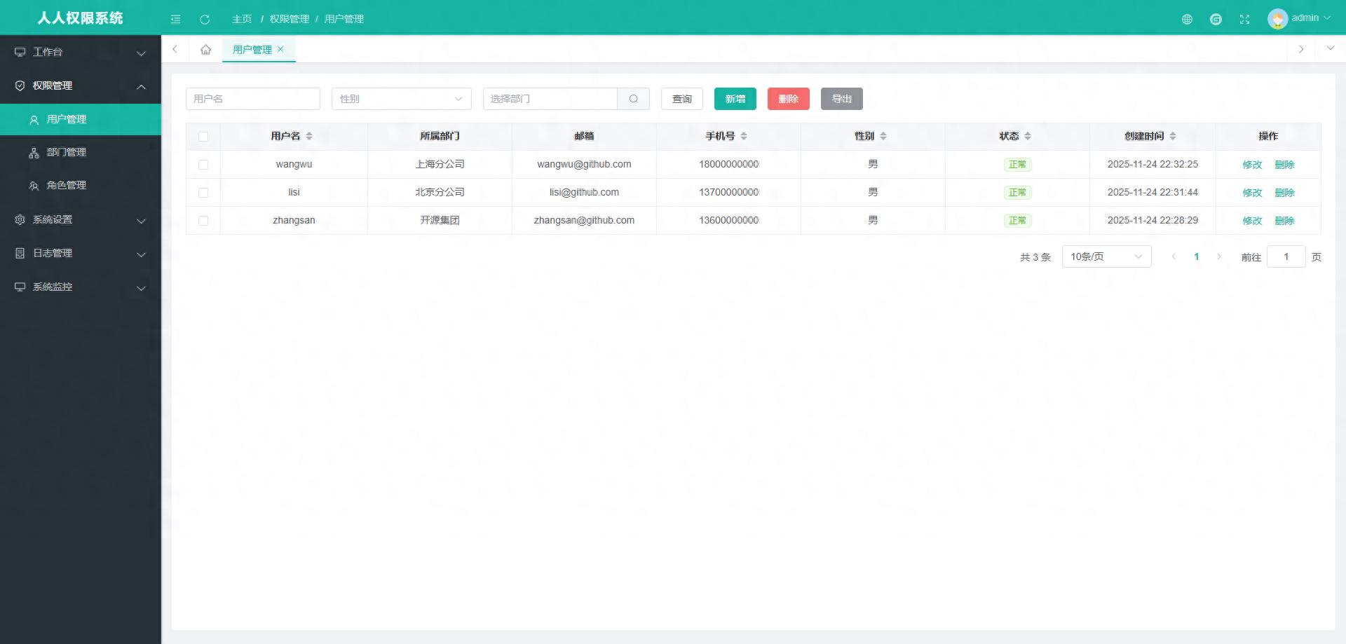 后端:SpringBoot3.x、Shiro、MyBatis-Plus前端:Vue3.x、TypeScript、Element Plus、Vue Router、Pinia、Axios、Vite数据库支持:MySQL 8.0+、达梦 8、Oracle 11g+、SQL Server 2012+、PostgreSQL 9.4+ 等主流数据库功能体验用户管理