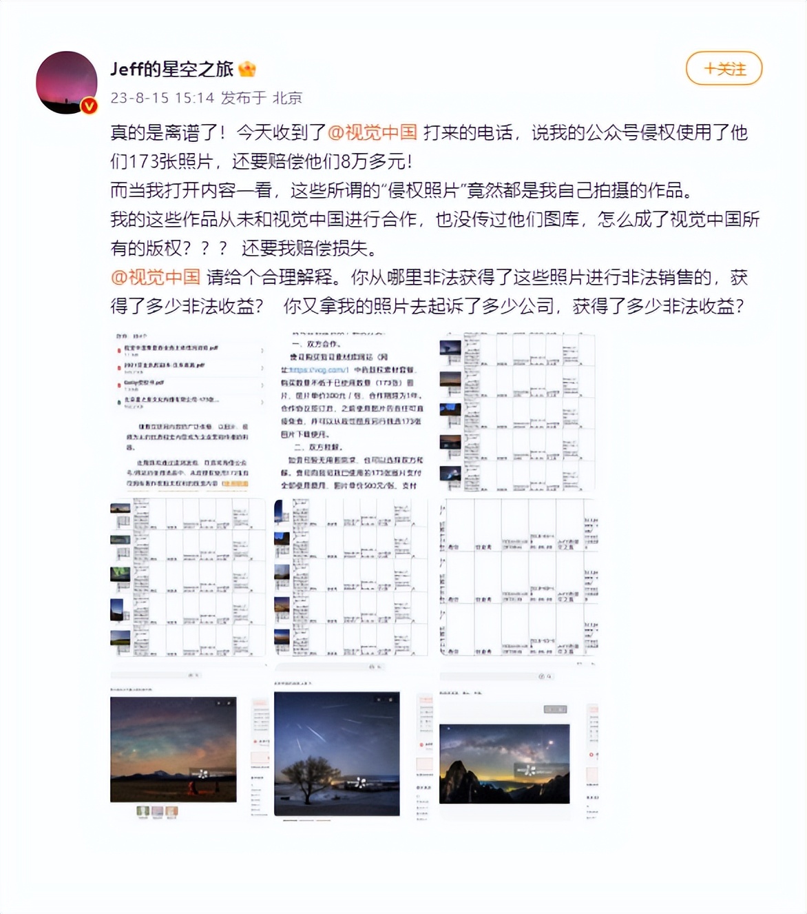 一、事件起源:摄影师遭遇“自我侵权”索赔2023年8月,知名星空摄影师戴建峰收到视觉中国通知,称其个人公众号使用173张照片构成侵权,需赔偿8万余元。但戴建峰核查后发现,被指控的“侵权图片”均为其本人拍摄作品,且从未授权视觉中国销售。这一“我侵权我自己”的离奇事件引发全网热议,视觉中国回应称其通过国际图库Getty Images获得“合法授权”,但戴建峰经与源头图库Stocktrek核实后否认该授权链条有效性,遂向天津和平区法院提起诉讼。