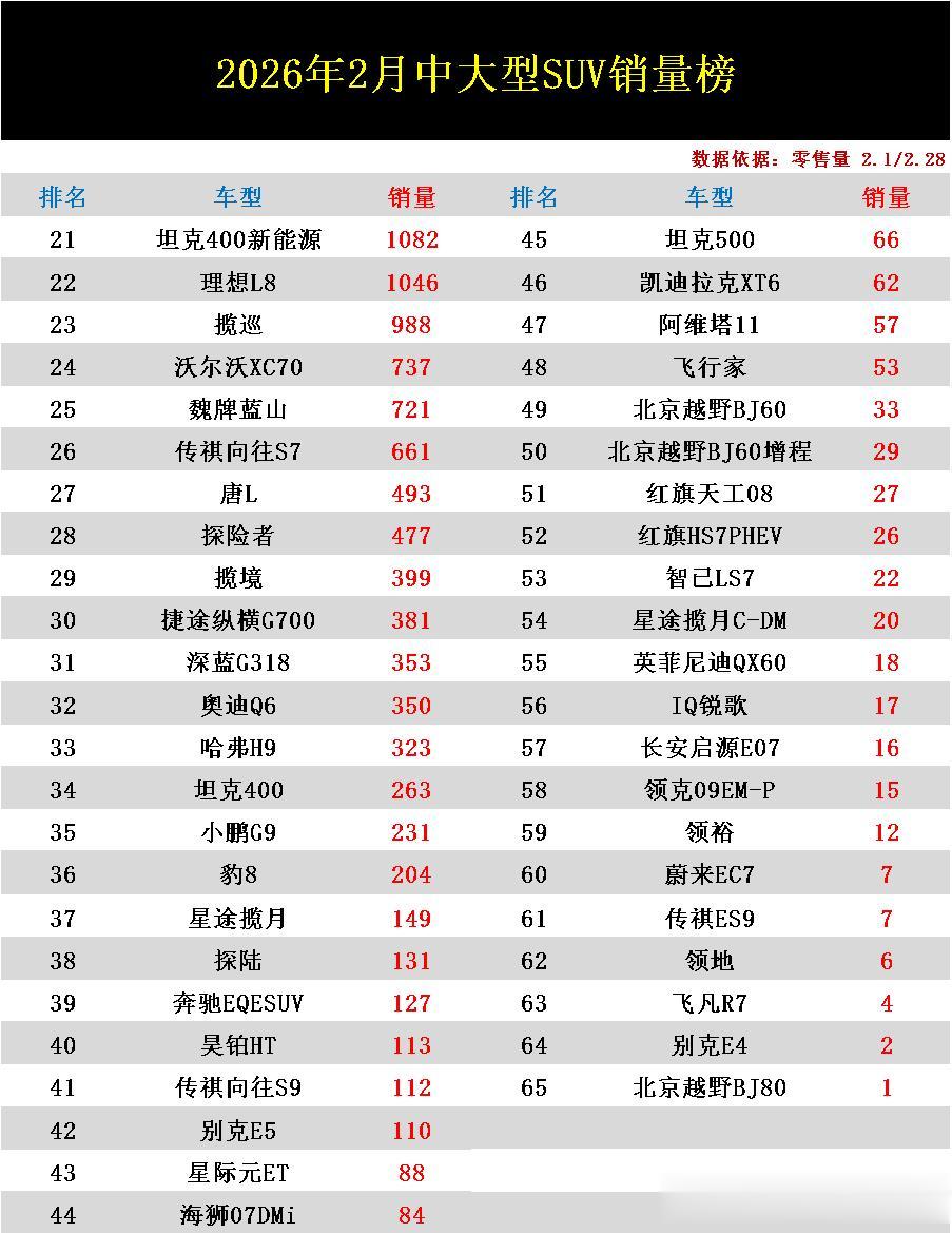 榜单的中后段呈现出冰火两重天的景象。在第二十名到第四十名之间,聚集了岚图FREE、智己LS6、坦克400新能源、魏牌蓝山等众多热门车型,销量集中在2000台至100台之间,竞争异常胶着,稍有不慎便会被对手超越。然而,从第四十名开外,市场迅速进入“冰点区”。大部分车型的月销量滑落至两位数,甚至个位数。例如阿维塔11(57台)、英菲尼迪QX60(18台)、别克E4(2台)以及垫底的北京越野BJ80(1台)。这些车型或因产品定位模糊,或因更新迭代缓慢,在激烈的市场竞争中逐渐被消费者遗忘。