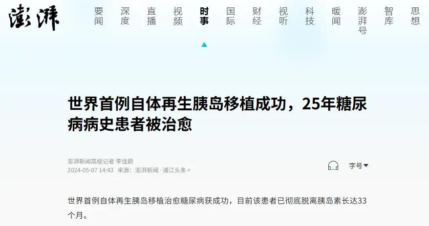 [6] Wu J, Li T, Guo M, et al. Treating a type 2 diabetic patient with impaired pancreatic islet function by personalized endoderm stem cell-derived islet tissue. Cell Discov. 2024;10(1):45. Published 2024 Apr 30.