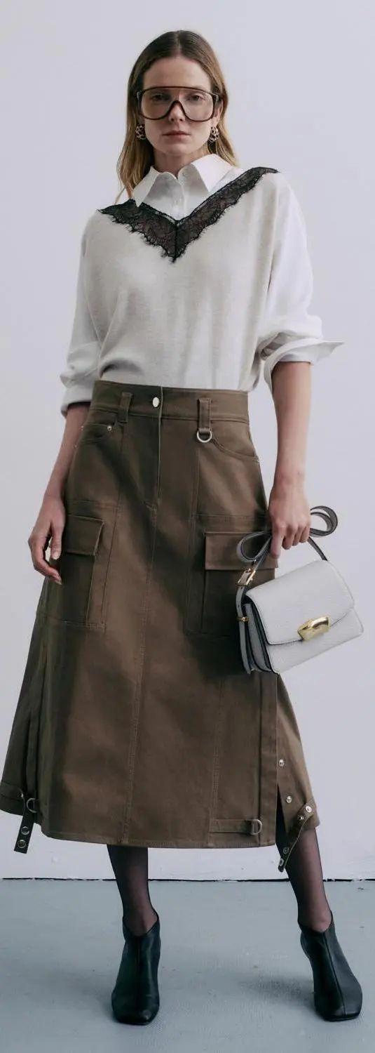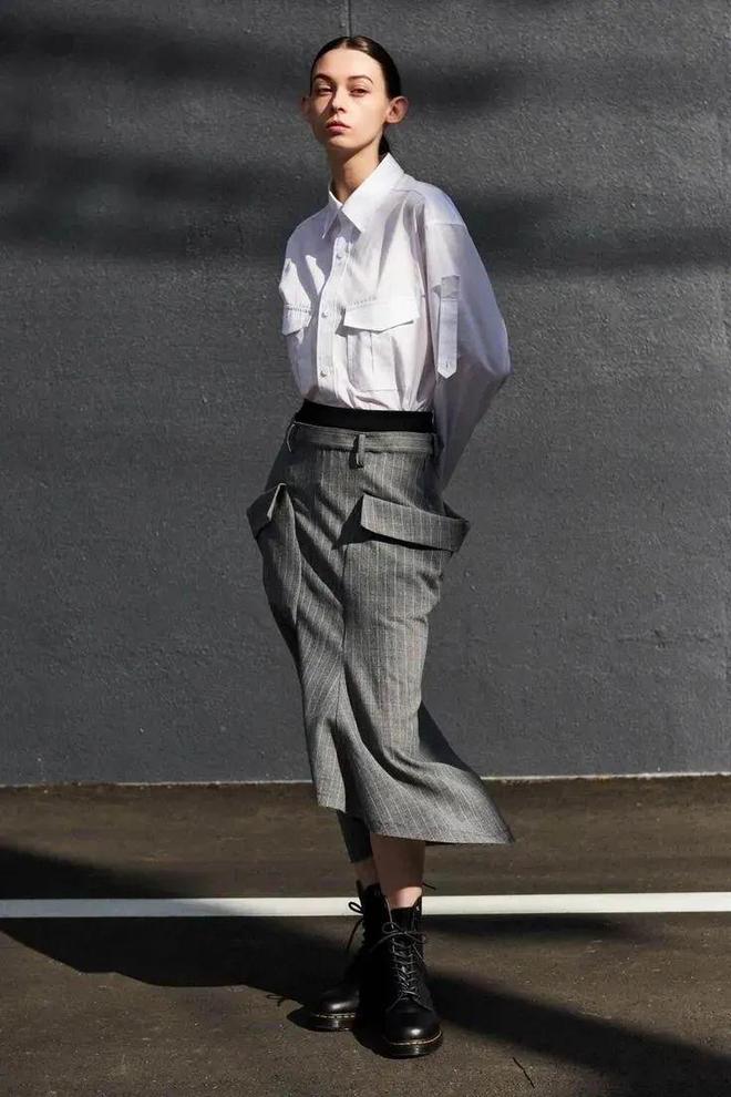 这件西装迷笛裙,搭配一件工装白衬衫,非常中性极简,搭配马丁靴更是增添了现代感。