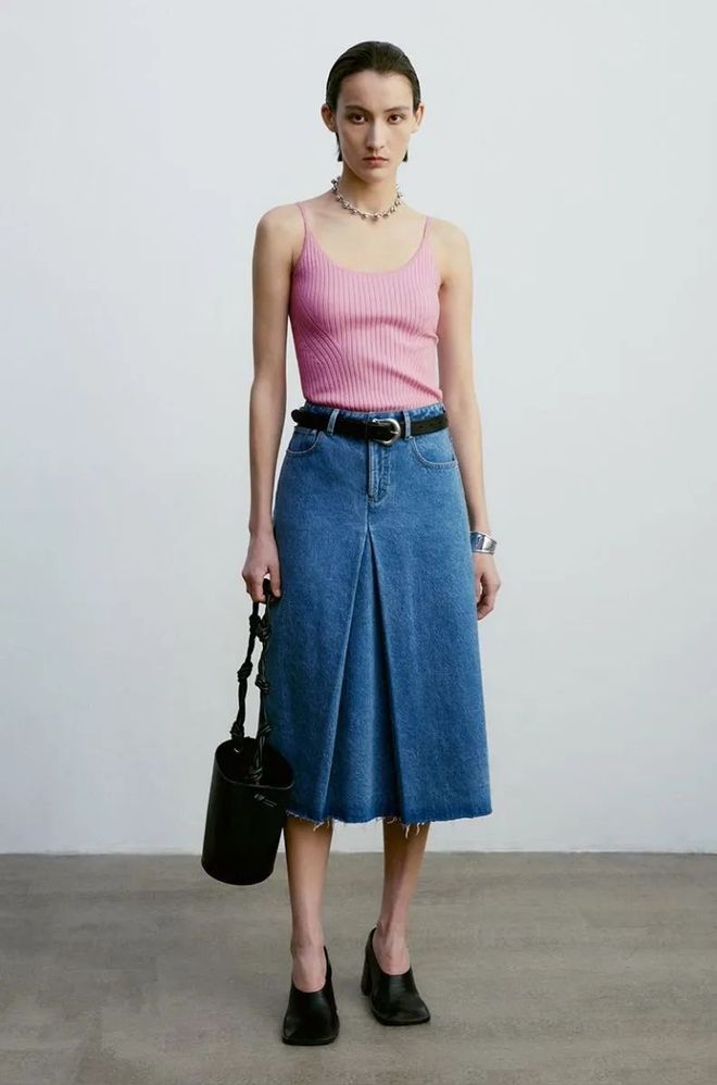 牛仔迷笛裙套装更显随性帅气,真的很能藏肉,但要注意上身内搭尽量选择短款,露出一点腹部会更有透气性!