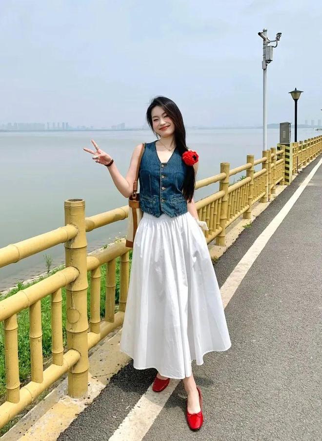 牛仔马甲+衬衫伞裙,使得look更具休闲感,像博主那样,长发飘飘加朵小红花,再搭双小红鞋,约会look搞定!