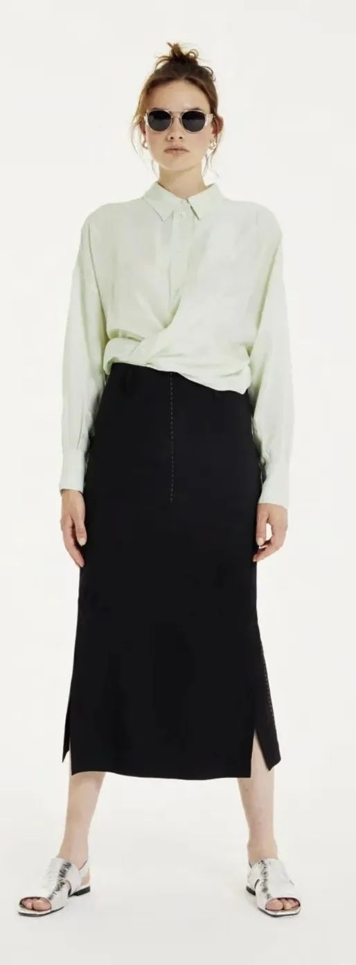 右边则落肩且带有设计感的衬衫,搭配颜色较浅的且裙长只到膝盖位置的半透针织裙,高级时髦,极简却很藏肉!