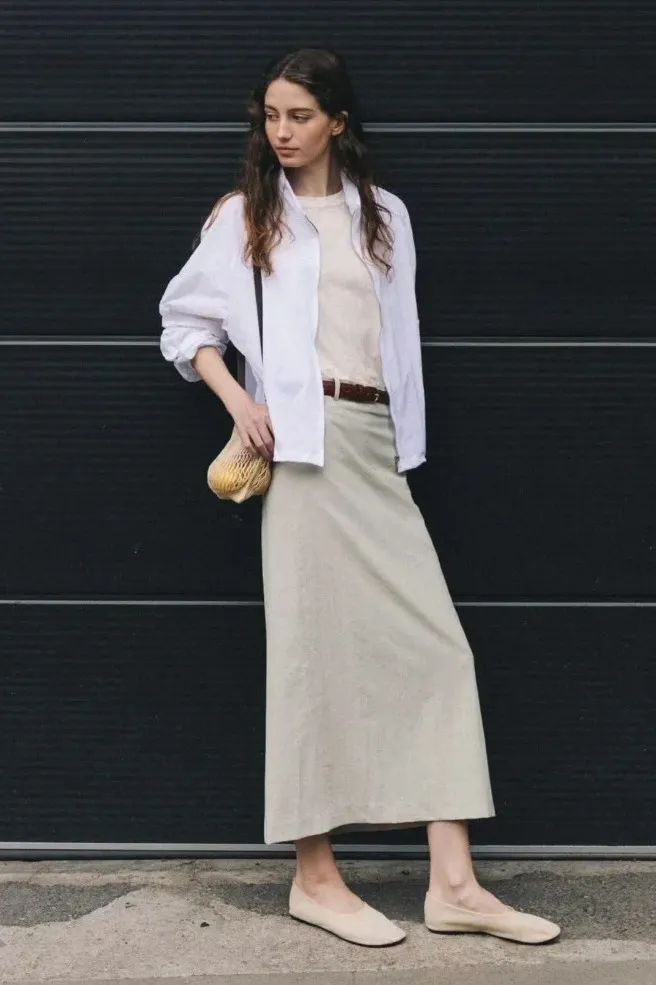 宽松款的T恤,搭配同样松弛飘逸感的迷笛裙,则更有自然文艺的舒适感,选择一双凉鞋或外穿半拖,再适合不过了,休闲惬意。