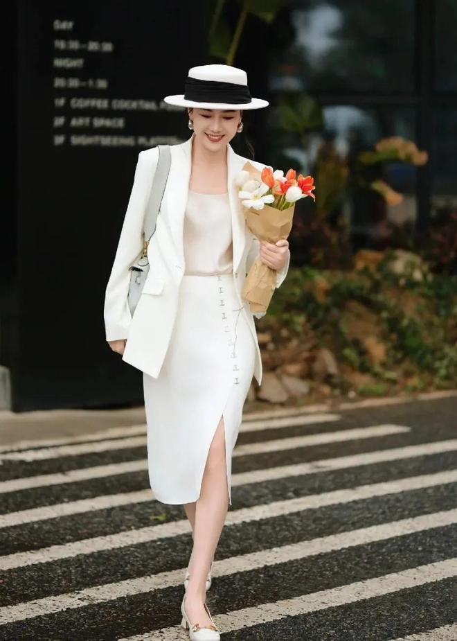白色系的西装+迷笛裙更凸显明净优雅,大气简约,