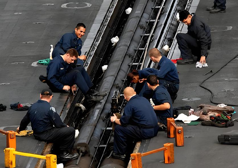 但之后,它的弹射效率就会大幅下降。原因在于,蒸汽弹射器单元需要专门的蒸汽罐储存高温高压蒸汽。经过频繁高速弹射后,蒸汽罐里的蒸汽压力和温度都会大幅降低。这时,航母就得猛烧锅炉,给蒸汽储存系统供给高温蒸汽,提升蒸汽压力。