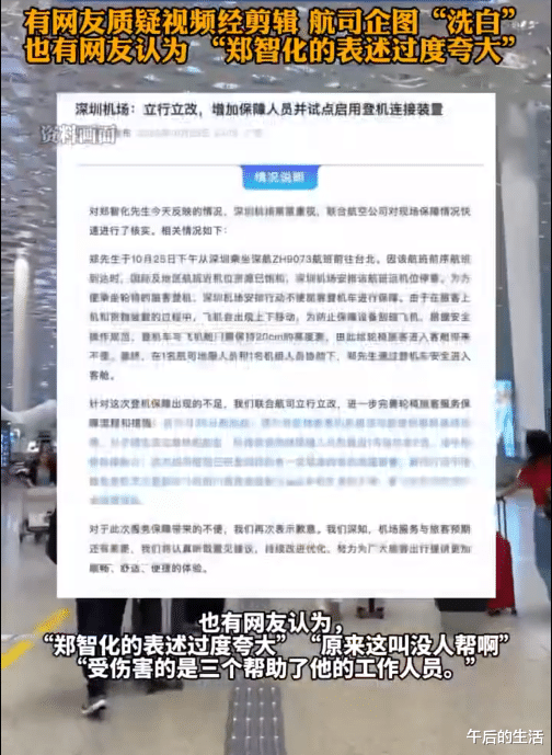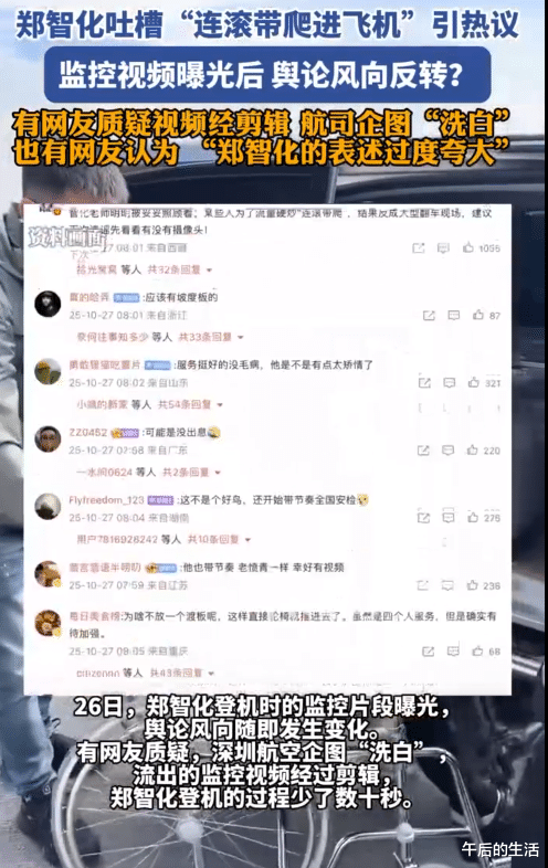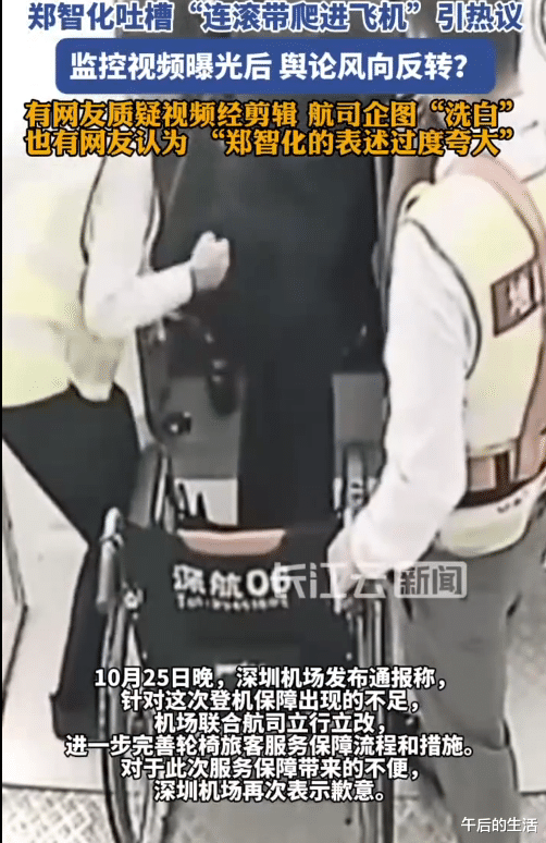事件始于郑智化乘坐轮椅登机时遭遇的尴尬场景。据其描述,升降板与机舱门存在20厘米间隙,导致他不得不"连滚带爬"进入机舱,而工作人员仅"冷眼旁观"。深圳机场随即公布监控视频显示:两名地勤人员全程搀扶其完成登机,舱门处另有接应人员。这一反差引发舆论分裂——支持者认为机场服务存在明显缺陷,反对者则指责郑智化"夸大事实"。