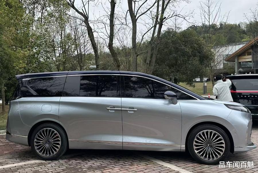 车侧一面,作为一款车长达5米3的中大型MPV,其车身整体显得修长且魁梧。而其不规则样式的个性化隐藏式D柱以及大尺寸悬浮式车顶样式,搭配密幅式轮毂,则同样能显露其侧颜的“大佬”气质与年轻、个性属性。