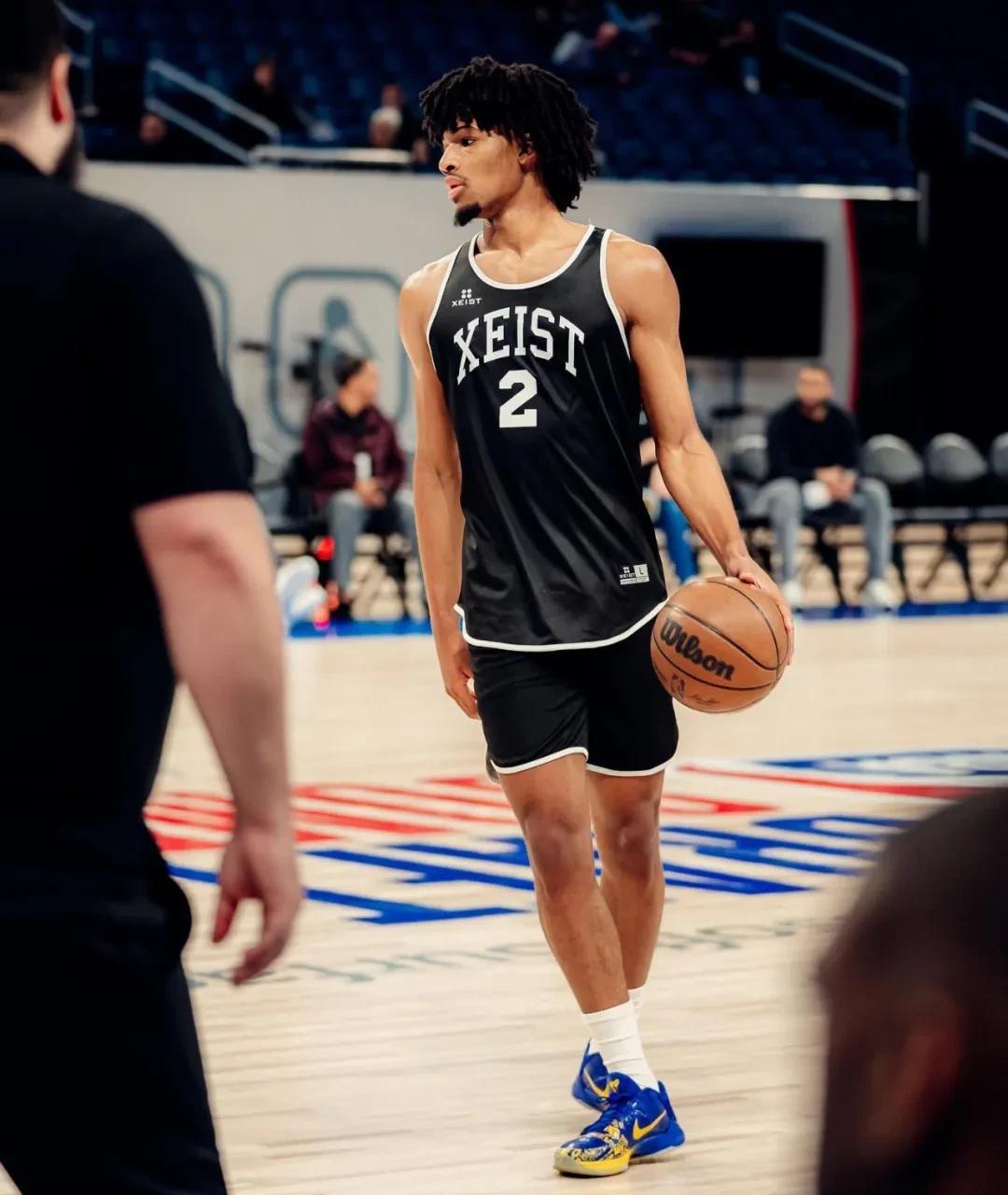 让我们将时间轴,拉回到2022年选秀夜。当肖华念出,第七顺位属于夏普,这位年轻人,已创造历史。他是自2006年后,又一位未经NCAA检验,便闯入乐透区的后卫。在那个选秀大年,夏普凭借的是,令人瞠目的体测数据。他身高1米96,这是得分后卫标准身高。他臂展达到2米12,这非常优秀。更恐怖的是,他垂直起跳,高度达到1米24。这让他即使在NBA,也保持着天赋优势。