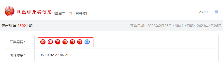 》》》双色球23021期开出2个偶数,号码为:02 05 06 19 21 27+04。